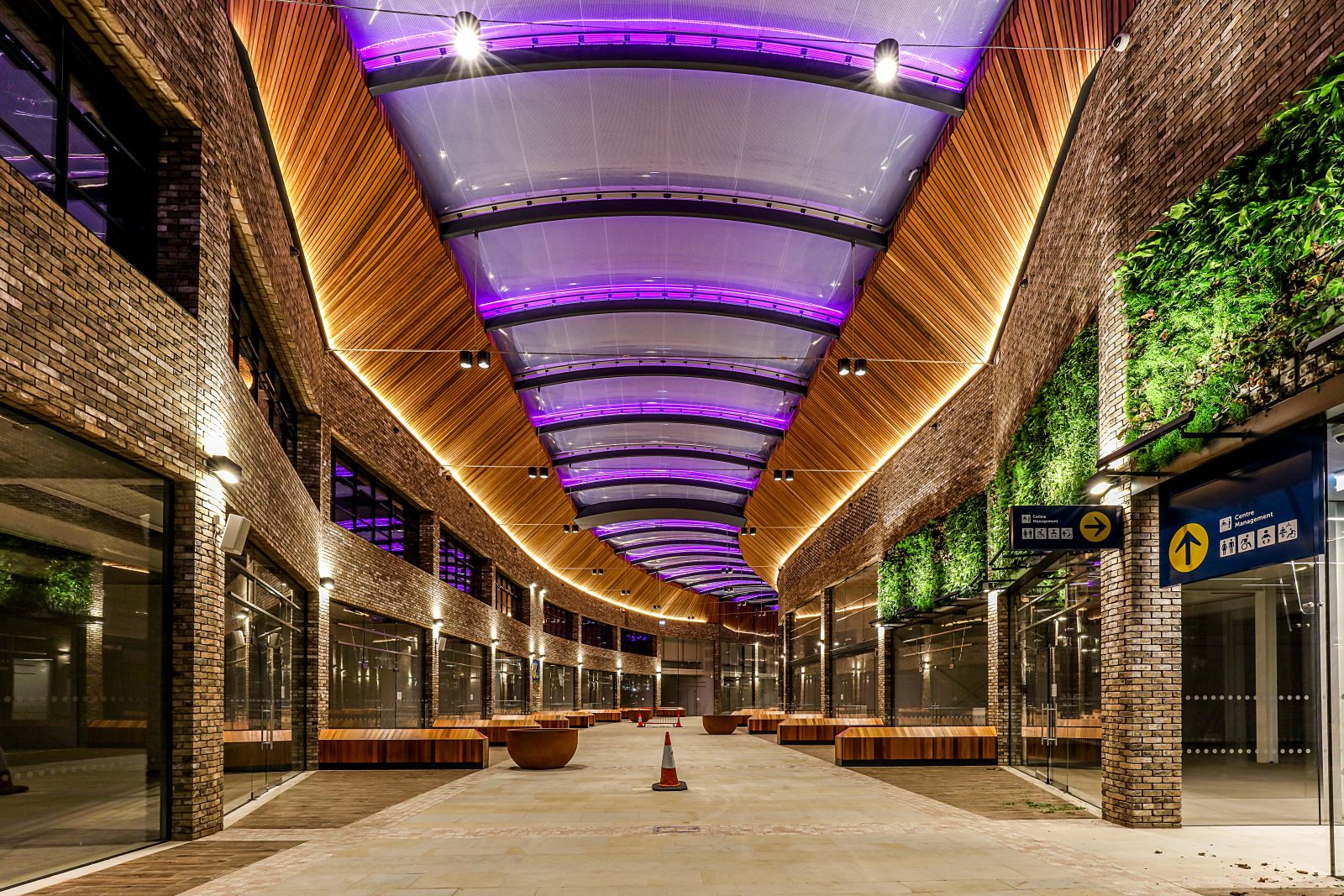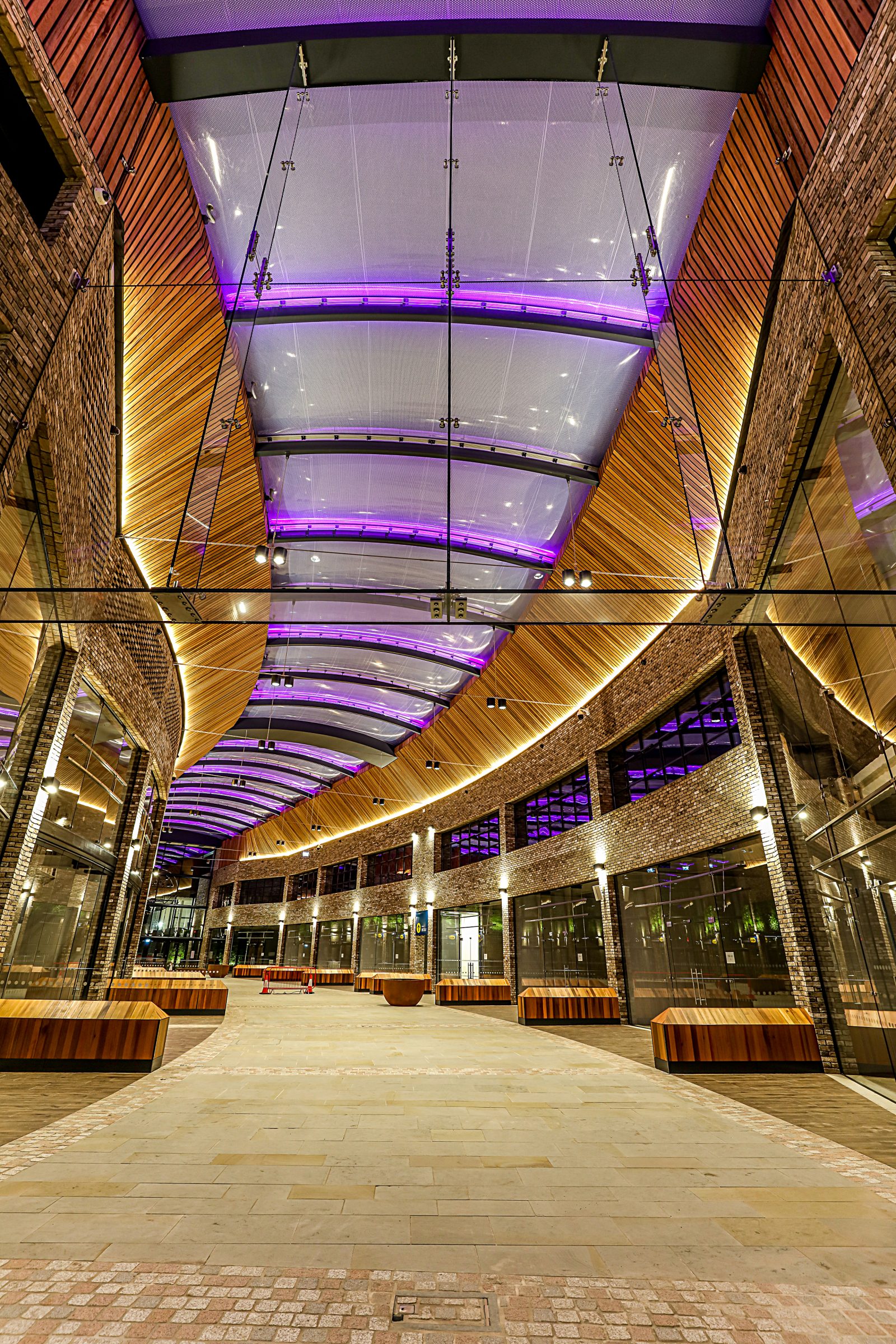 The Food Court follows an arced plan so one of the challenges was to design high level ribbon glazing which would follow the natural curve of the building and sit comfortably with the circumference of the external facades.
